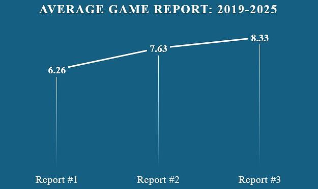 Regarding the self-reflection reports, as expected, the content and quality of writing improved after each game, with an overall average grade increase of 19.6% between Report #1 and Report #3. It is important to note that students who decide to write Training Report #1, which is optional, tend to receive higher grades in Report #1. If all students chose to write Training Report #1, the average for Report #1 would be much higher.