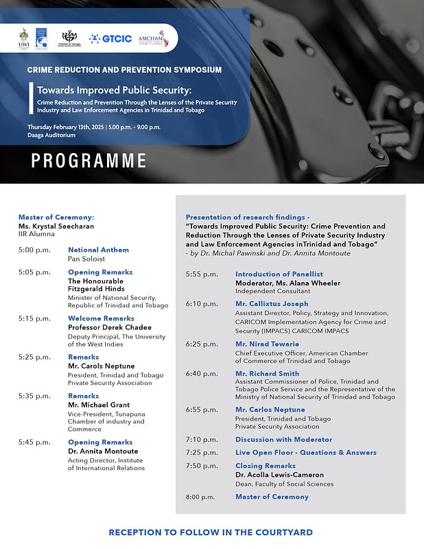 The organization of this symposium has been motivated by the empirical research conducted by the faculty of the Institute of International Relations at the University of the West Indies, St. Augustine Campus, Dr. Michał Pawiński and Dr. Annita Montoute.Public Security in Trinidad and Tobago. The findings will serve as the background for the discussing the possibility of enhancing public security through collaboration between the private security industry and law enforcement agencies.